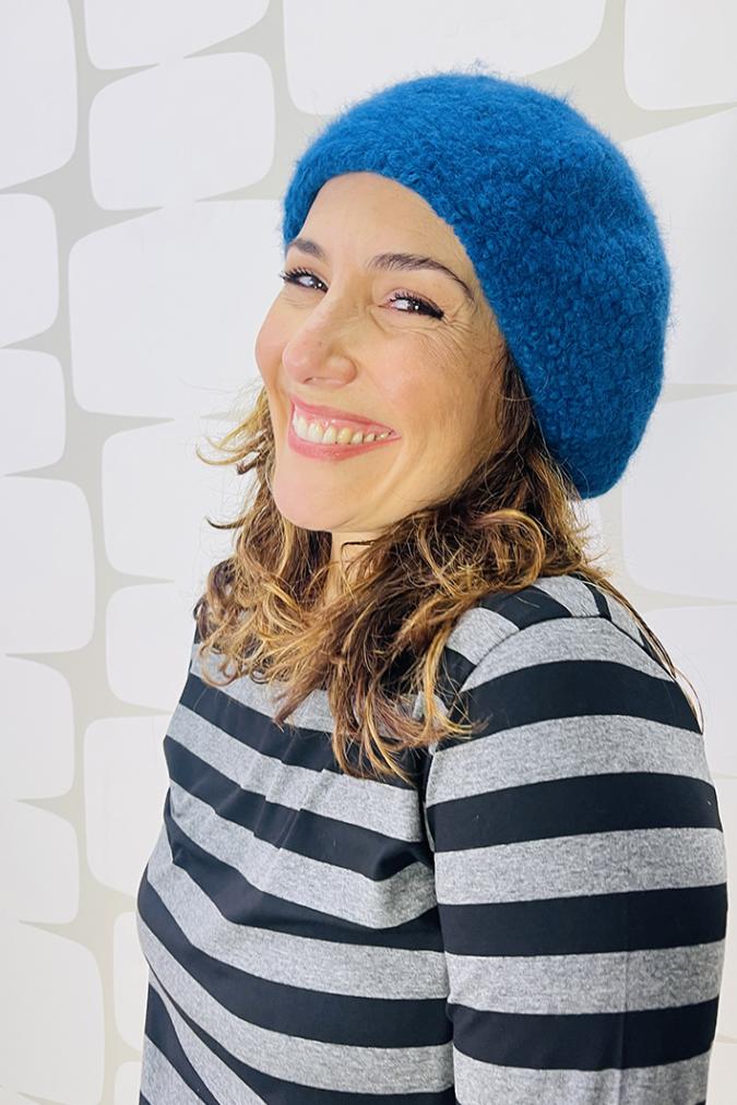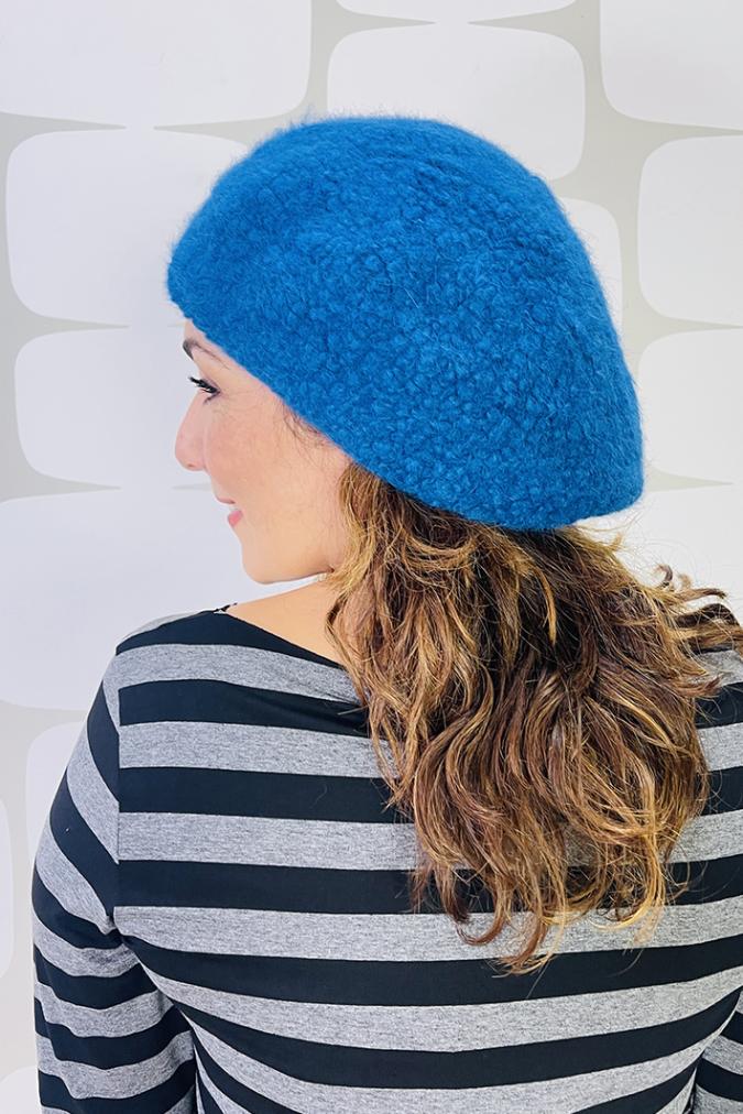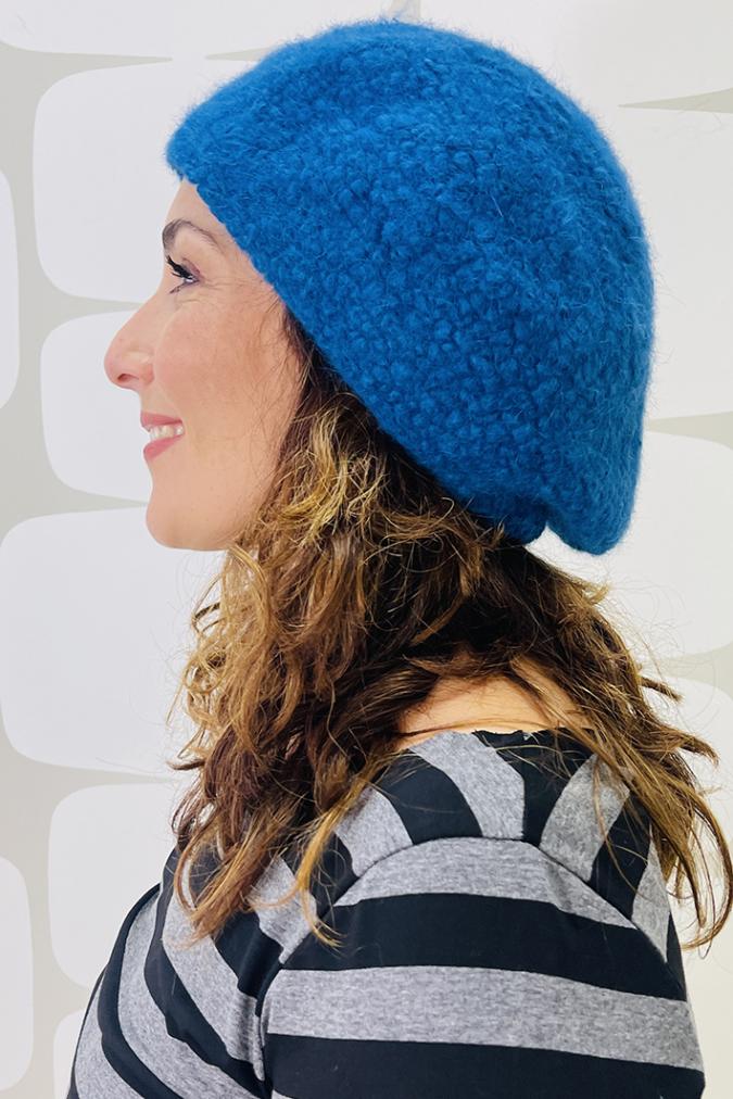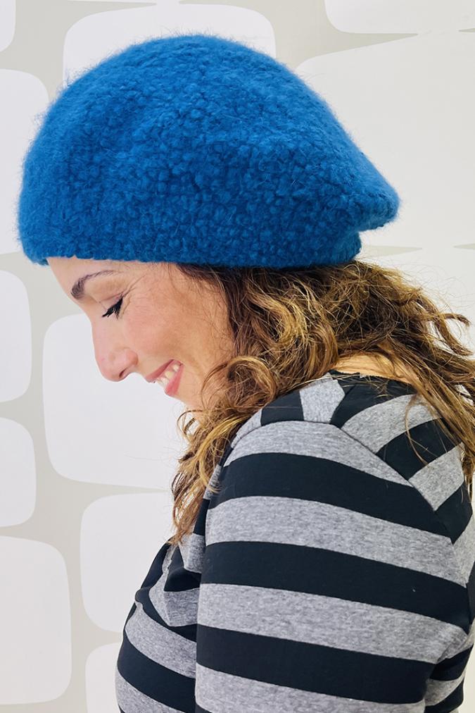 Cappello basco bouclè in misto lana con laccio interno per regolare la circonferenza.
