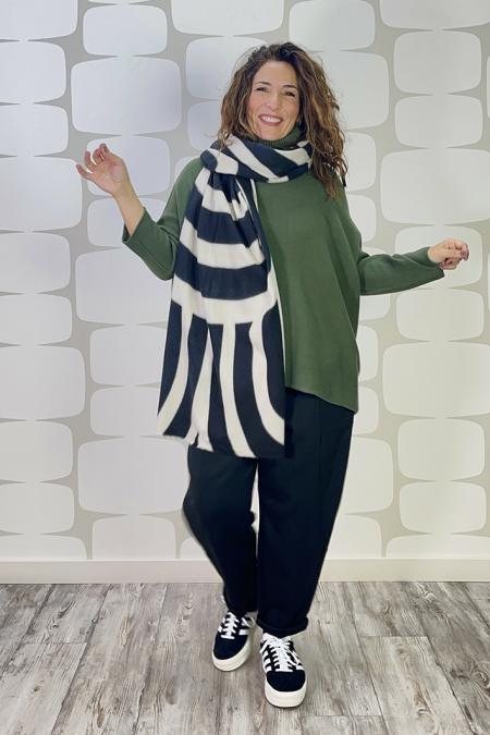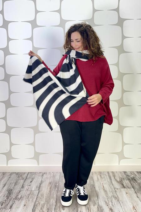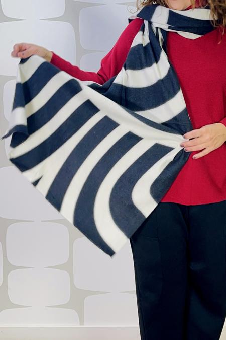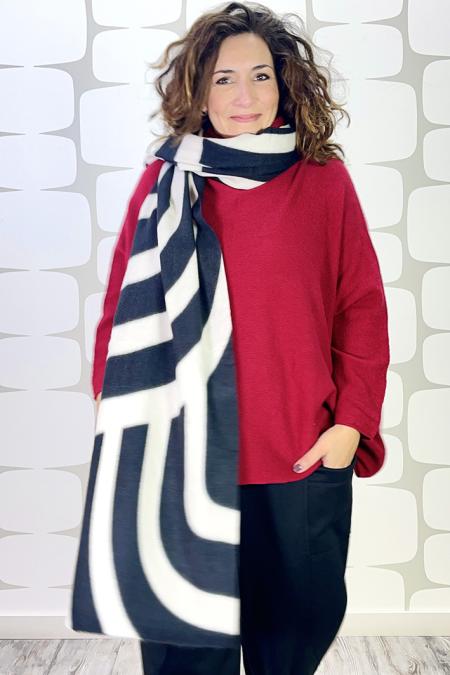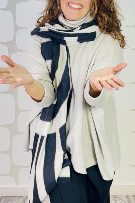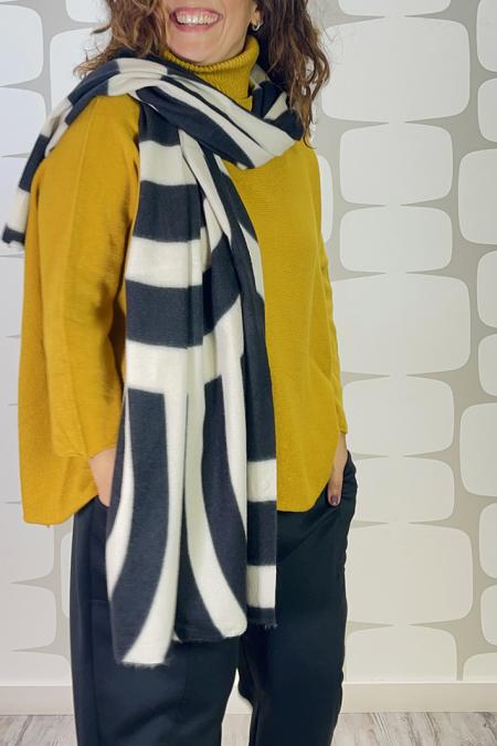 Sciarpa in calda viscosa bianco/nero decorata con note musicali. Lunga 215 x 53 cm.