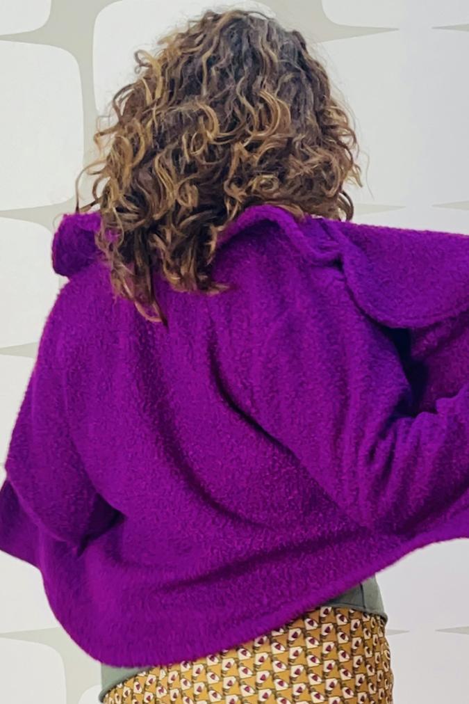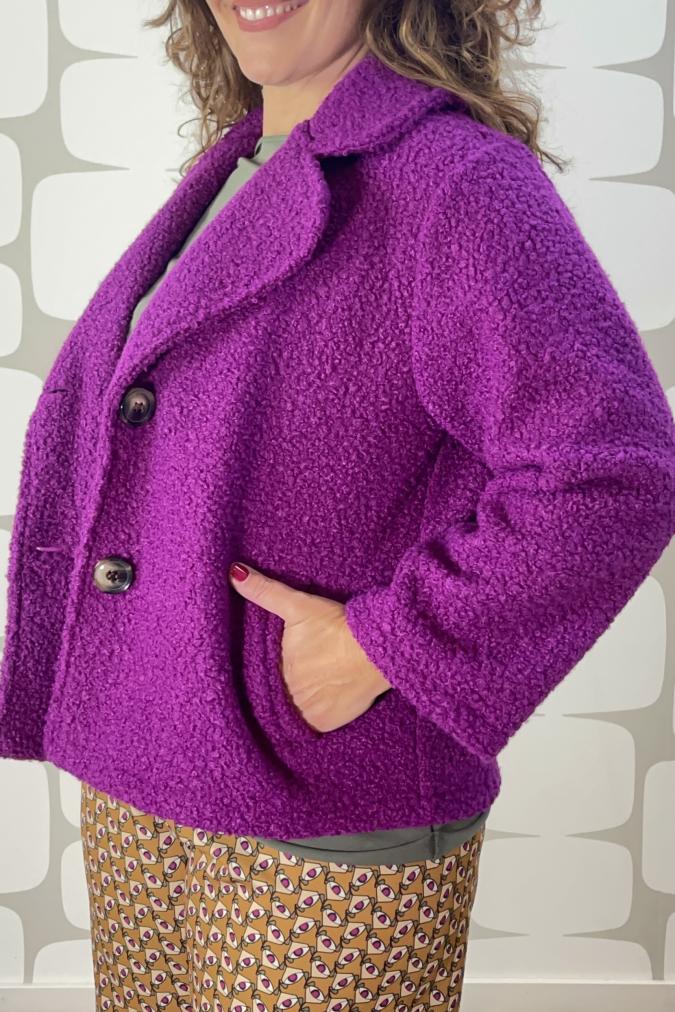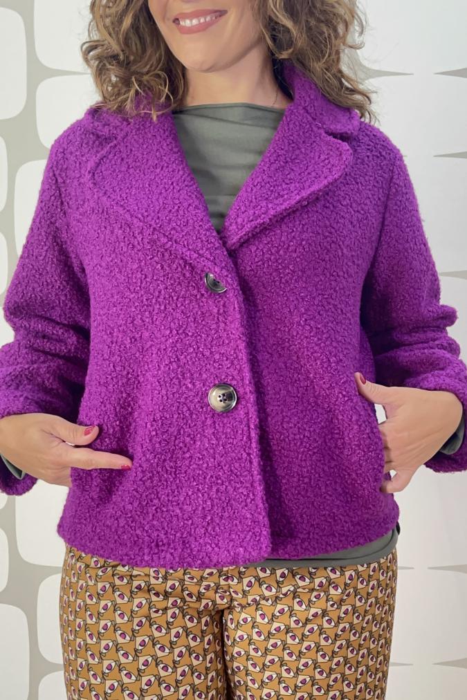 Cappottino teddy dalla linea regolare con tasche a filetto, chiusura con 2 bottoni e collo reverse.