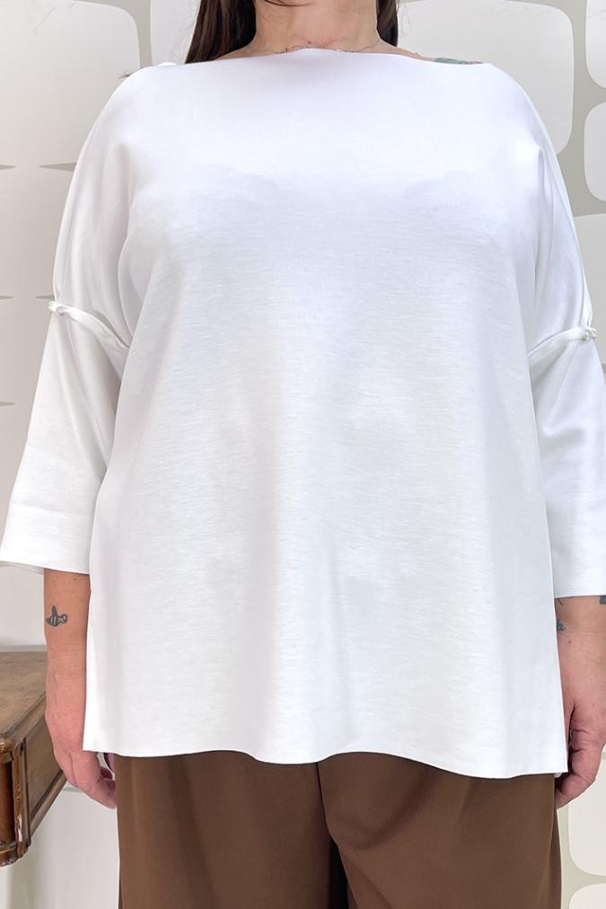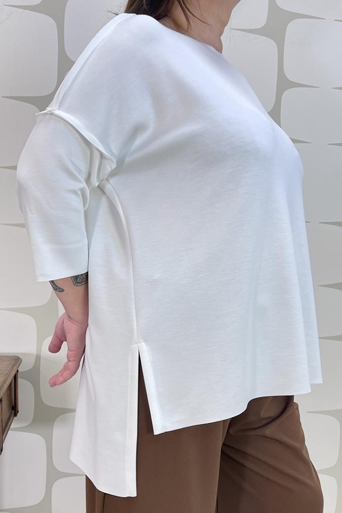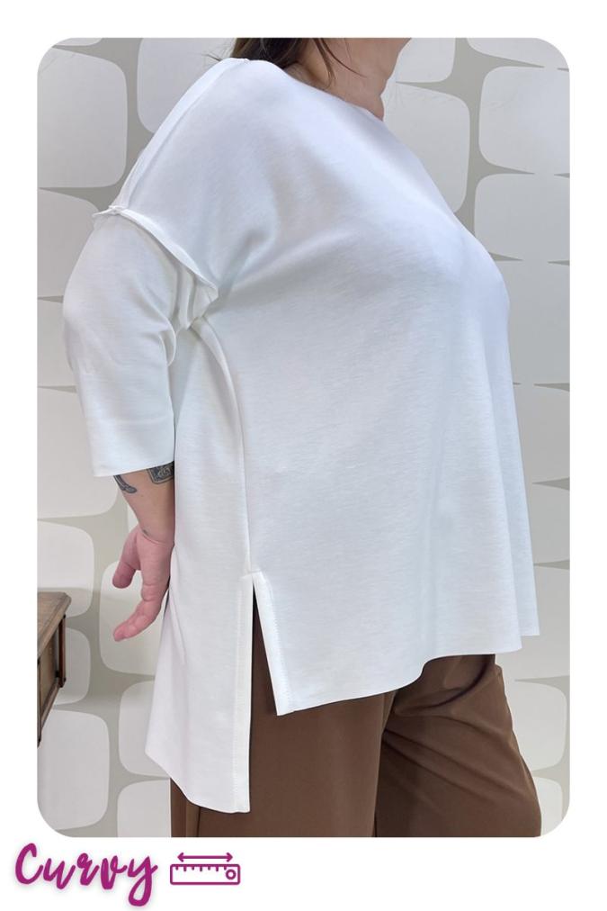 Maglia morbida dalla linea over con spalla scesa, cuciture a vista, asimmetrica nelle lunghezze con spacchi laterali più lunga dietro e poco meno davanti.