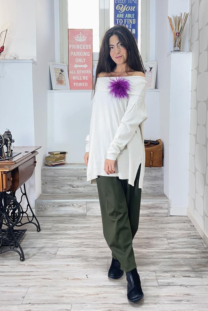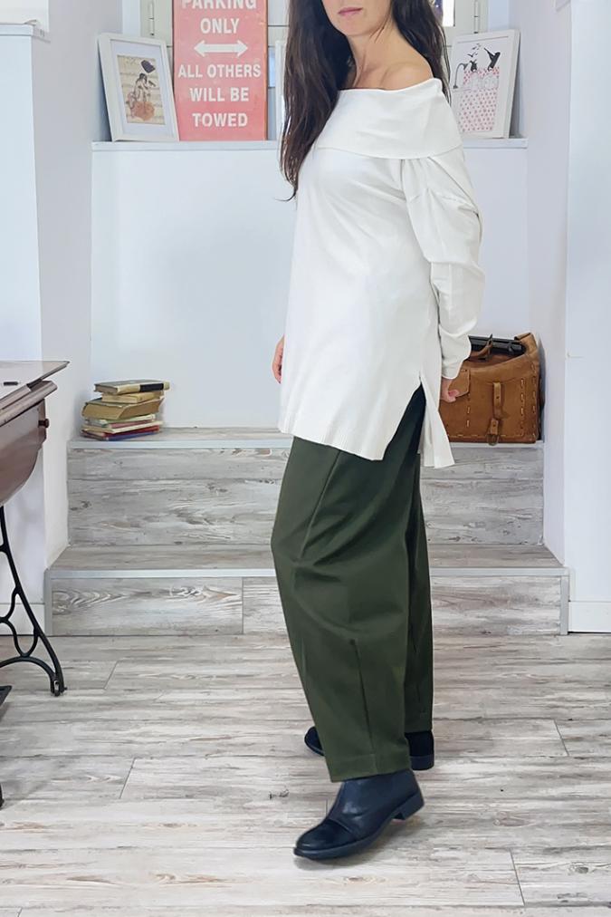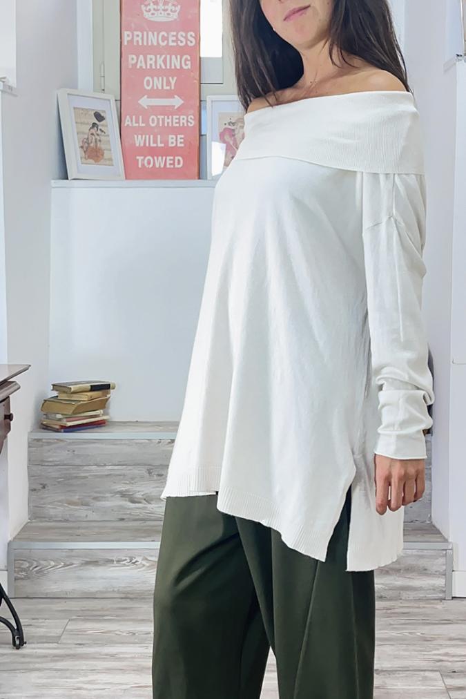 Maxi maglia elasticizzata con collo ampio e rigirato, spalla scesa e spacchetti laterali.