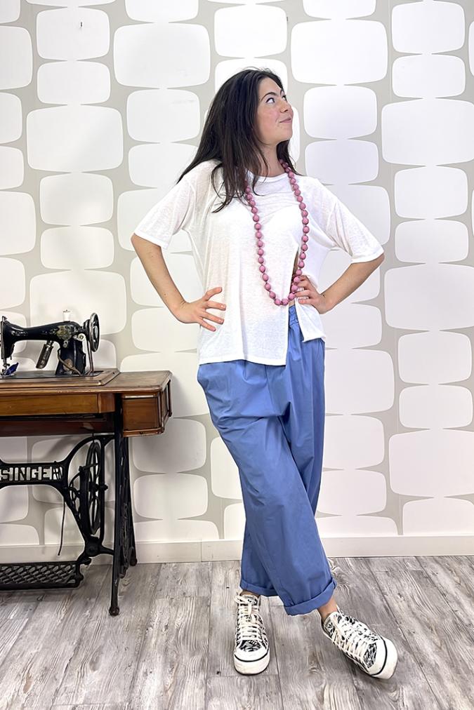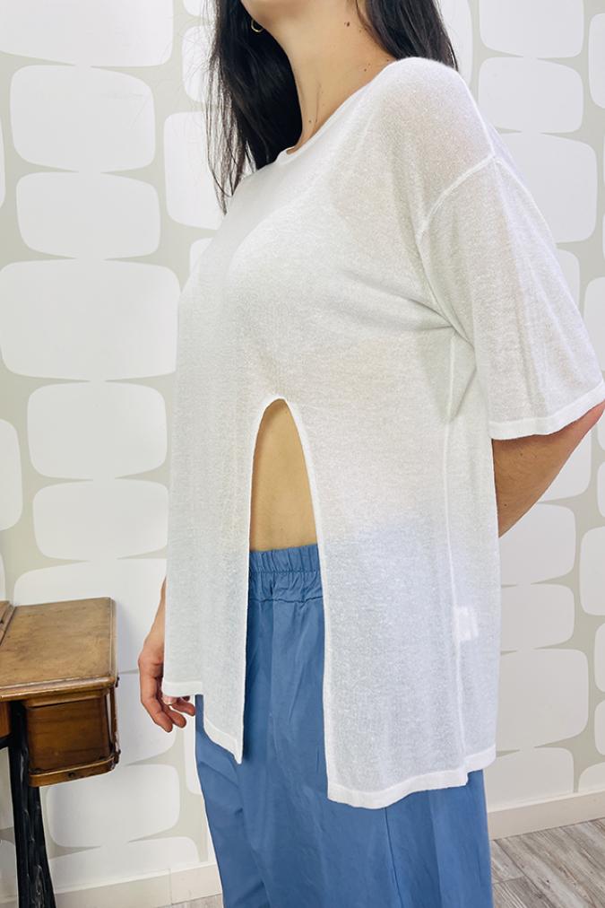 Maglia morbida in misto lino dalla linea regolare con scollo tondo e spacco frontale. Ideale per le sovrapposizioni.