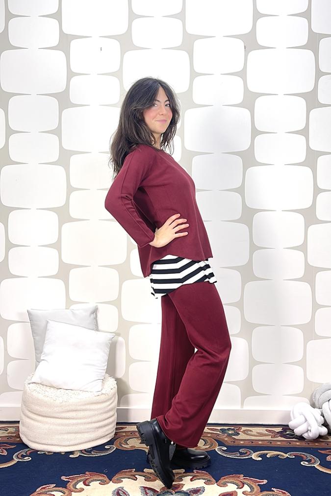 Pantalone palazzo dalla linea regolare in maglia elasticizzata morbida e confortevole.
