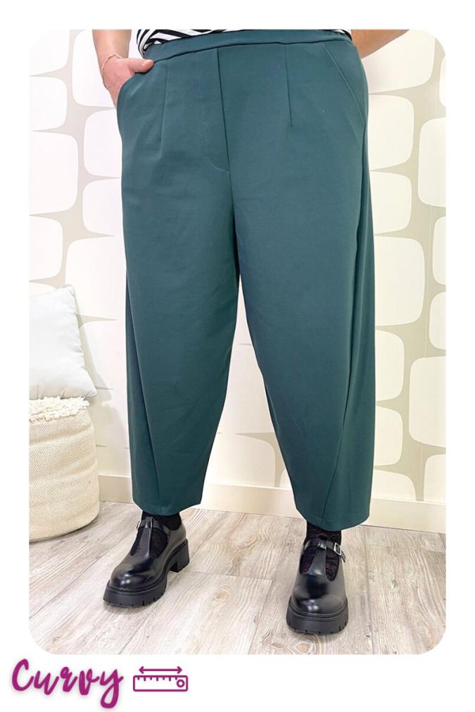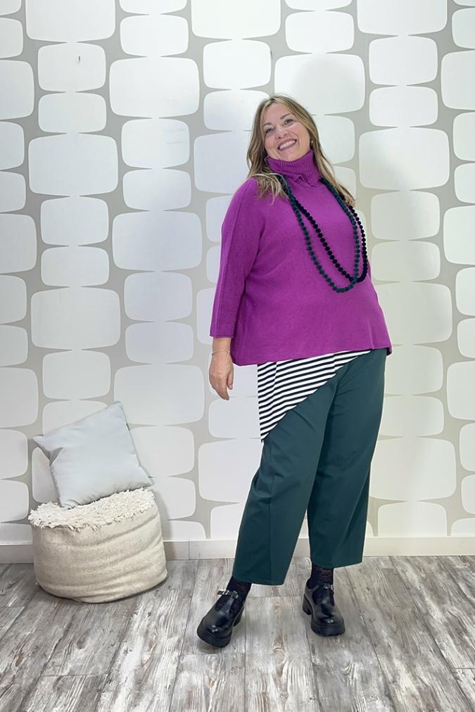 Pantalone con taglio del fianco obliquo che accompagna e slancia la gamba. Vita elasticizzata adattabile comodamente a più taglie e pratiche tasche laterali.