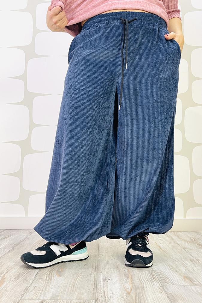 Pantalone a coste dalla linea bombata racchiusa da un elastico nell'orlo, vita elasticizzata con coulisse e tasche a laterali.