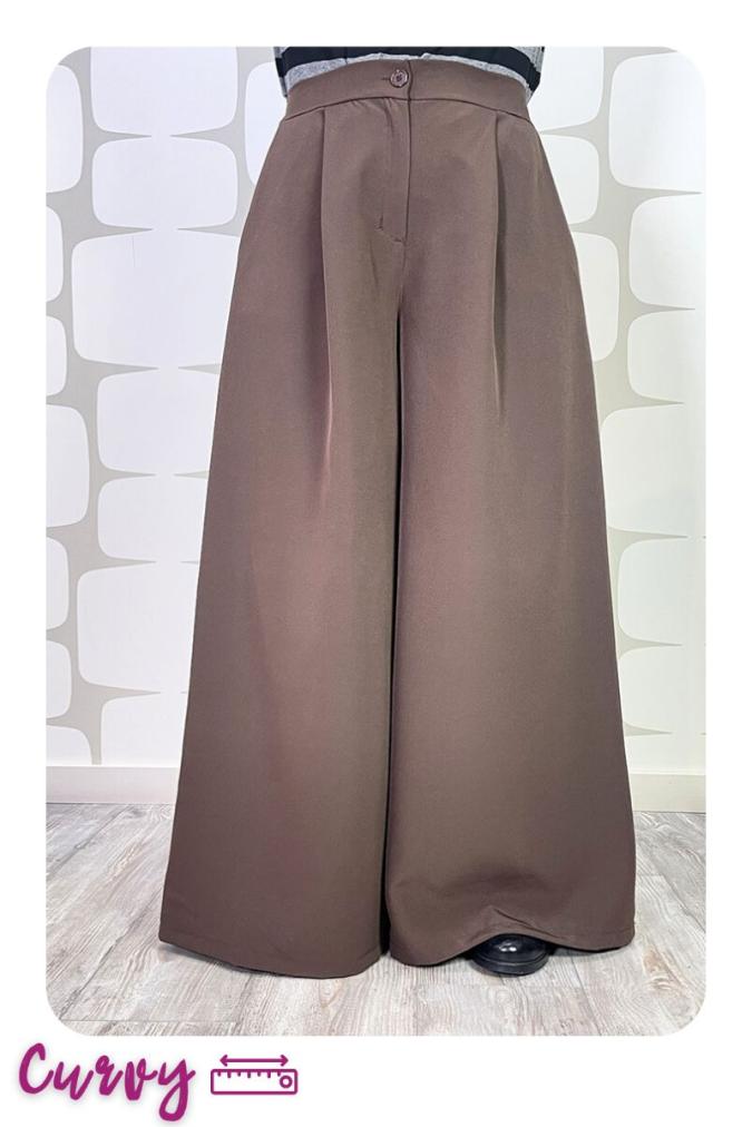 Pantalone linea over dal taglio maschile con pences frontali e chiusura con zip e bottone, vita arricciata sul dietro e tasche laterali.