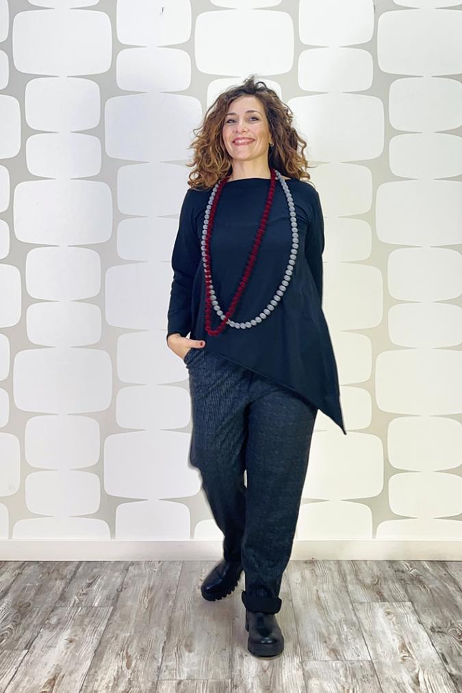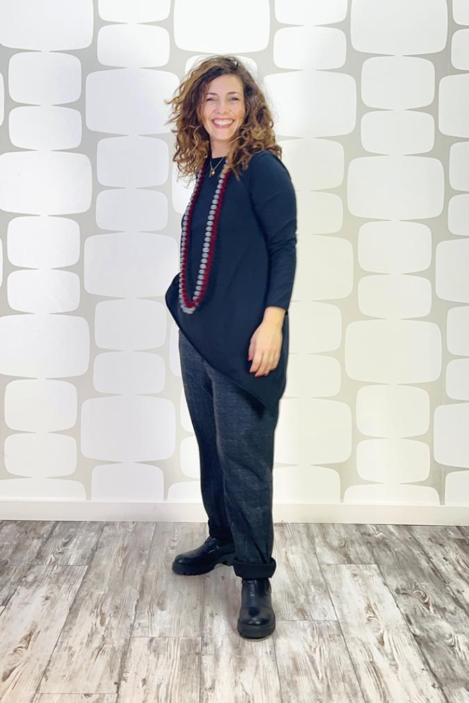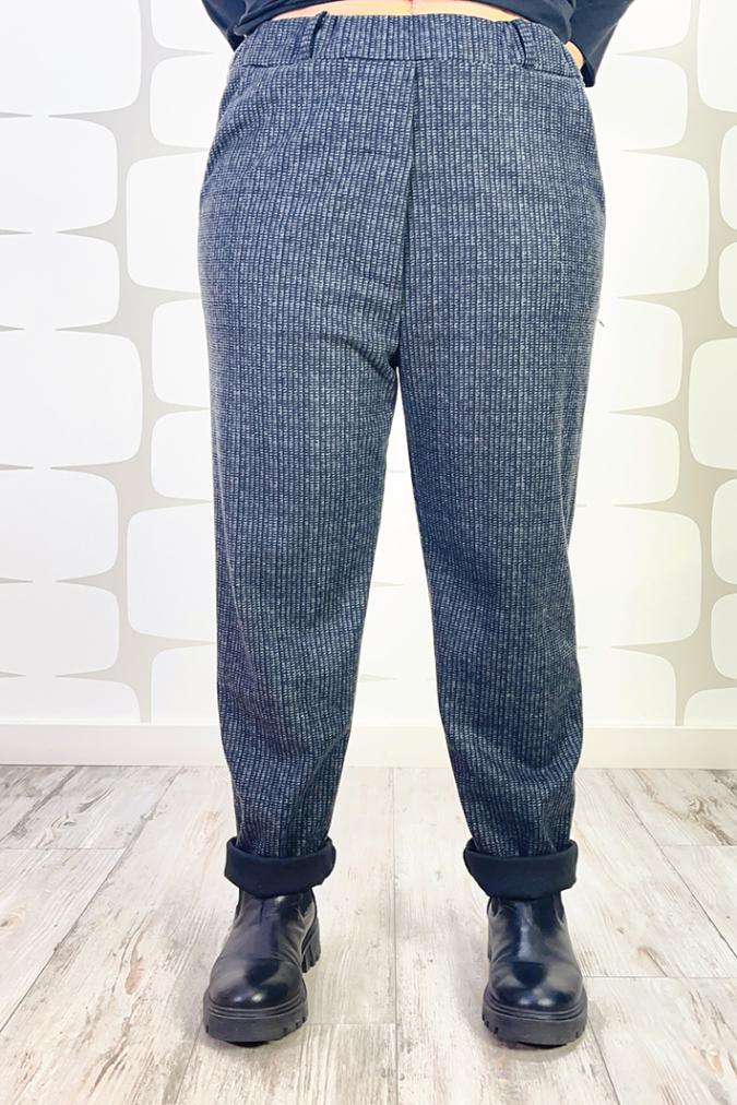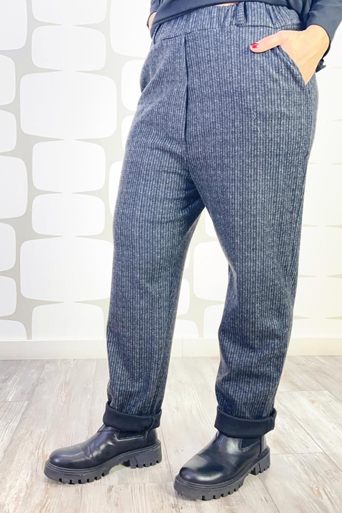 Pantalone confortevole con elastico in vita, finta patta sul davanti e tasche laterali.