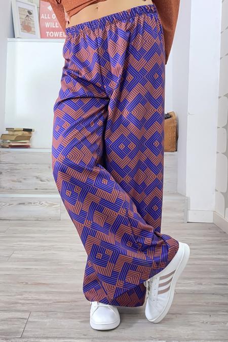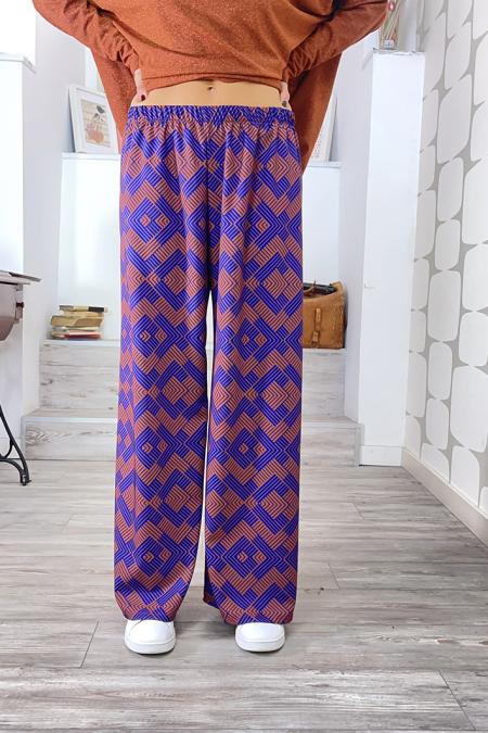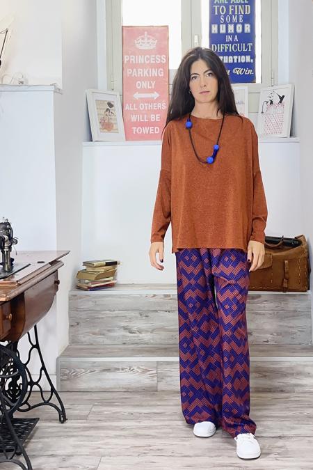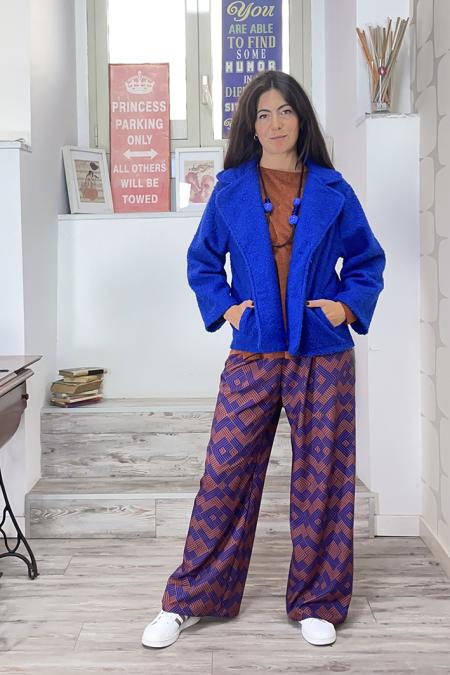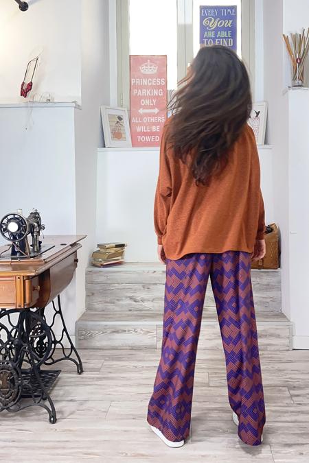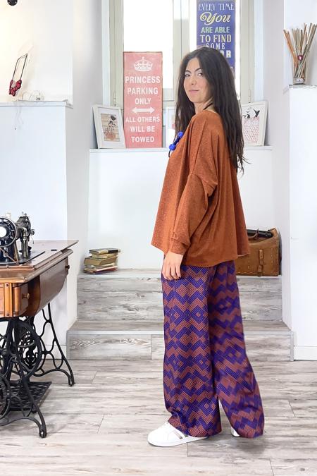 Pantalone dalla linea palazzo con pieghe sul davanti, tasche laterali con vita elasticizzata e passanti per cinta.