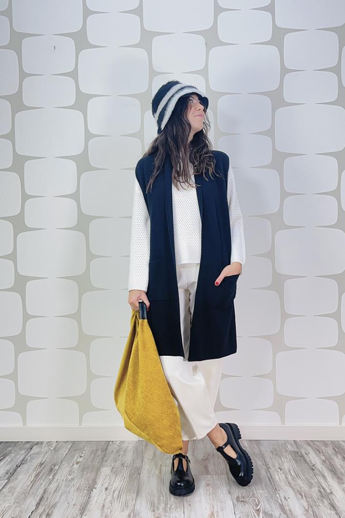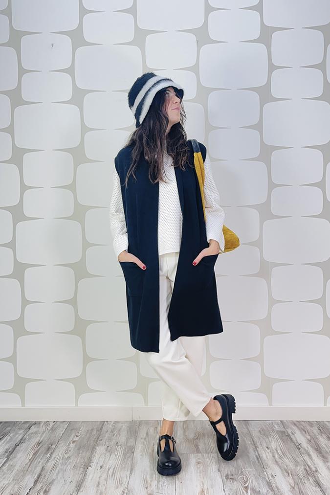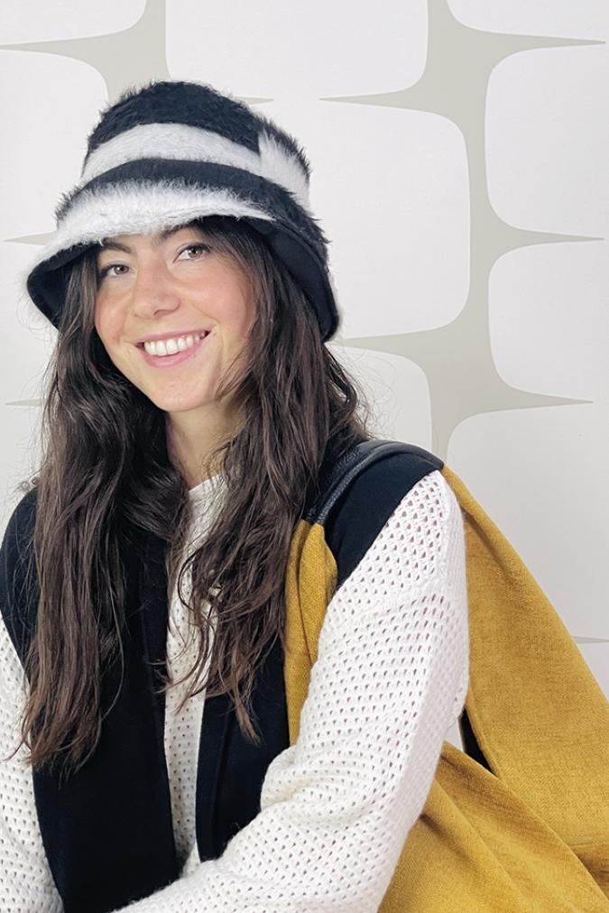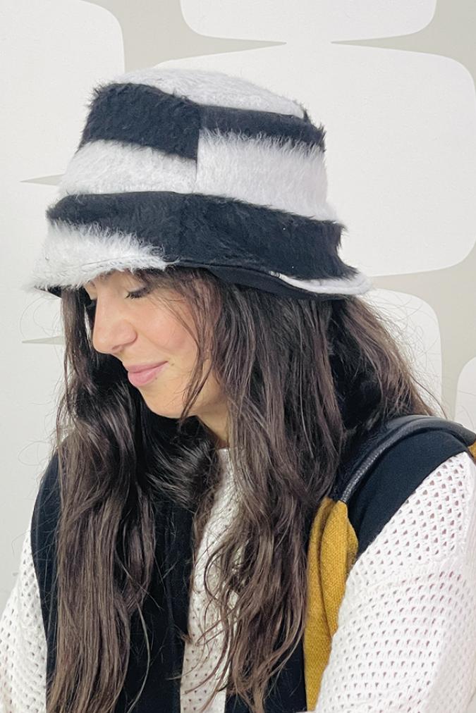 Cappello realizzato nella nostra sartoria, linea bucket in tessuto misto dall'effetto pellicciadalle tonalità bianche e nere, con rivestimento in caldo pile è indossabile anche al rovescio!