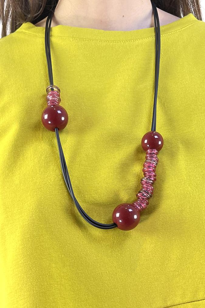 Collana in doppio filo di caucciù con sfere in resina e anellini in vetro di Murano.Lunghezza 90 cm