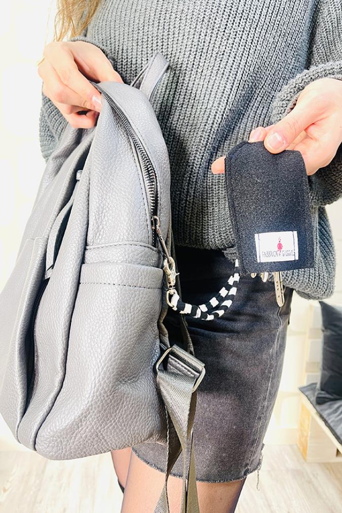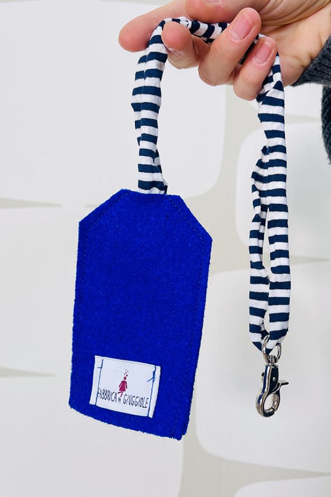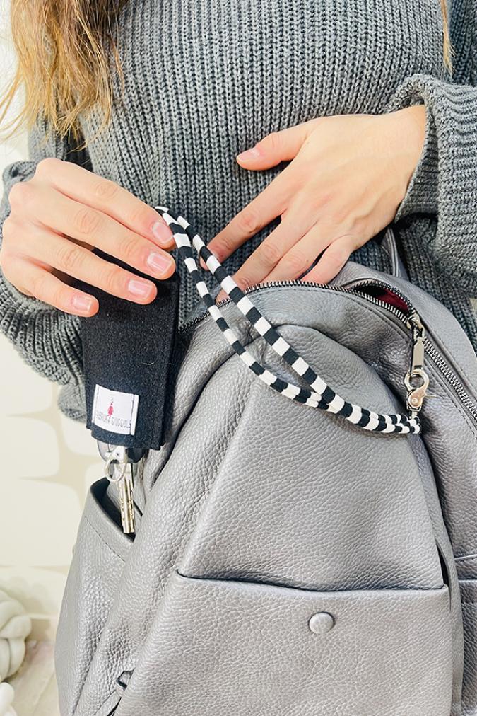 Simpatico portachiavi con moschettone e anello "a scomparsa". Perfetto per proteggere le tue chiavi, attaccarle alla borsa, puoi indossarlo anche al collo con il pratico nastrino a righe. Regalo perfetto per te o per qualcuno a cui vuoi bene!