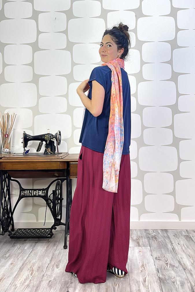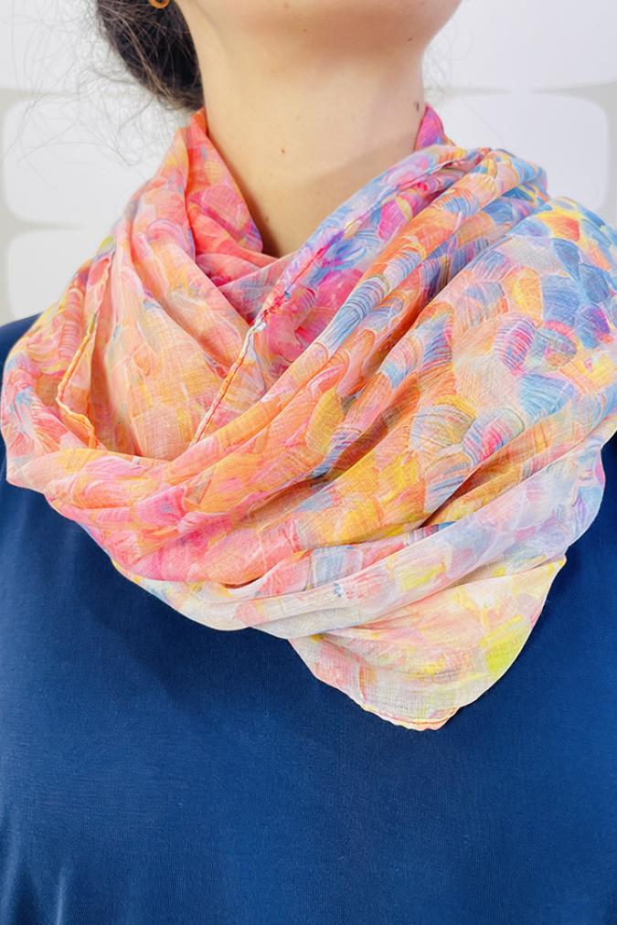 Scelto per voi!Sciarpina in misto viscosa e lino, con fantasia ad acquerello sui toni del giallo o arancio.