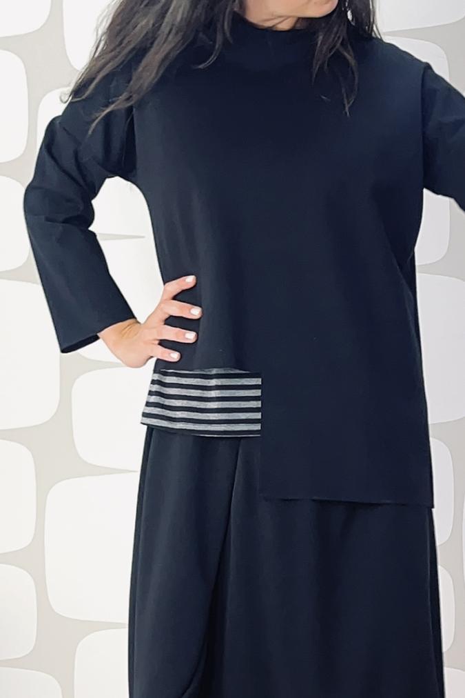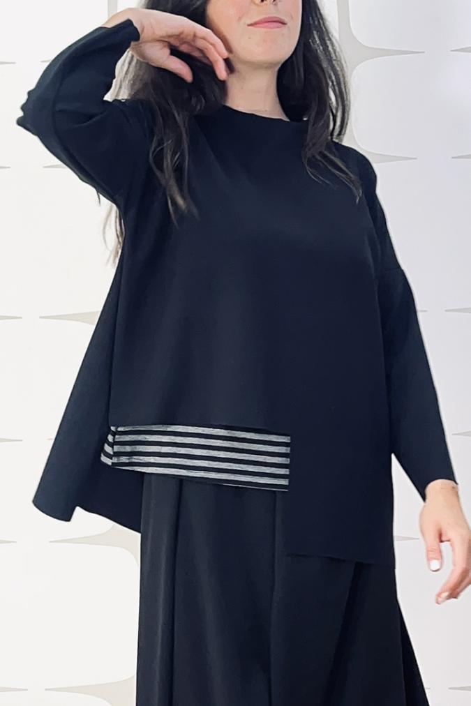 Maglia spalla scesa con scollo bordato e tagli al vivo su maniche e orlo asimmetrico. Tagli al vivo e collo bordato.