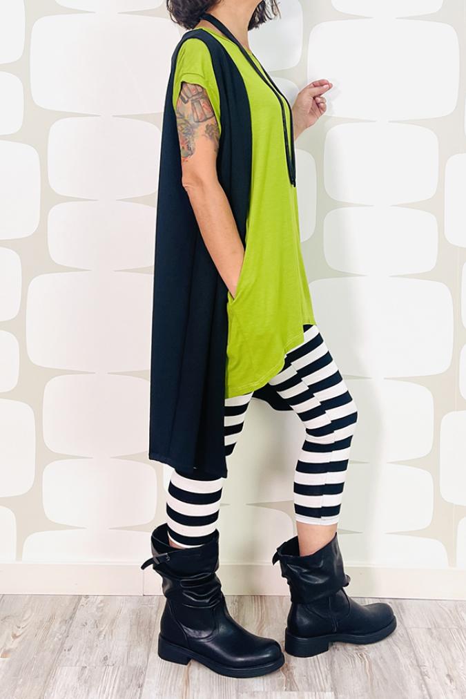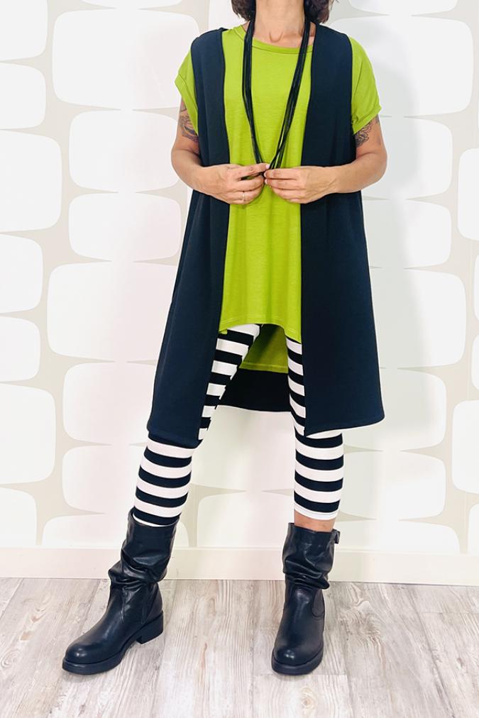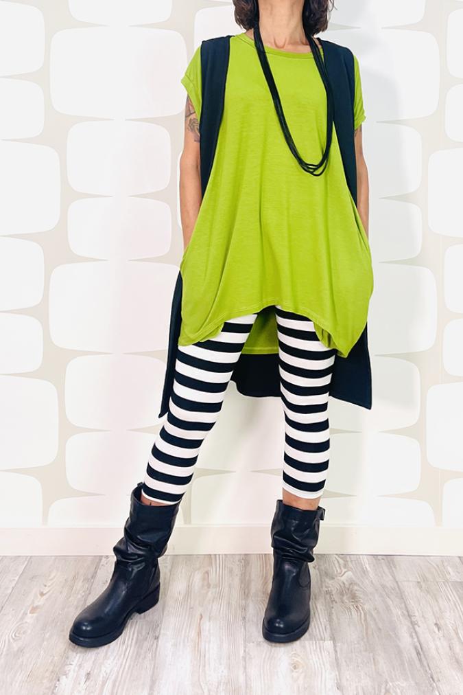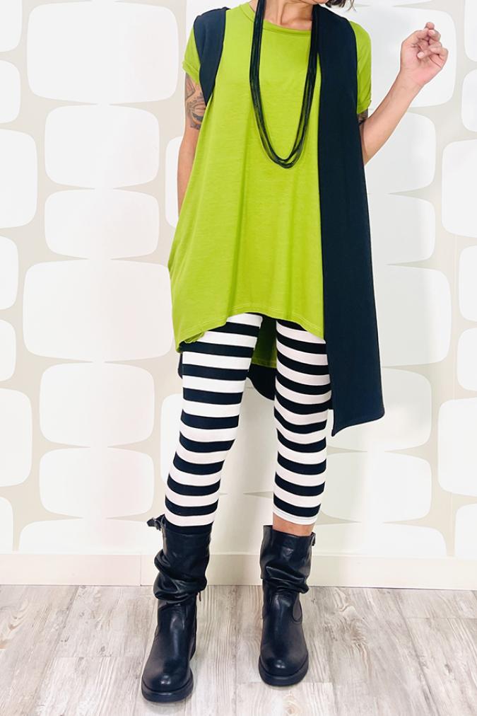 Leggings in morbida viscosa elasticizzata che avvolge la linea senza perdere la forma originale. La fantasia è la nostra riga larga da 2 centimetri, scegli la combinazione adatta al tuo stile.