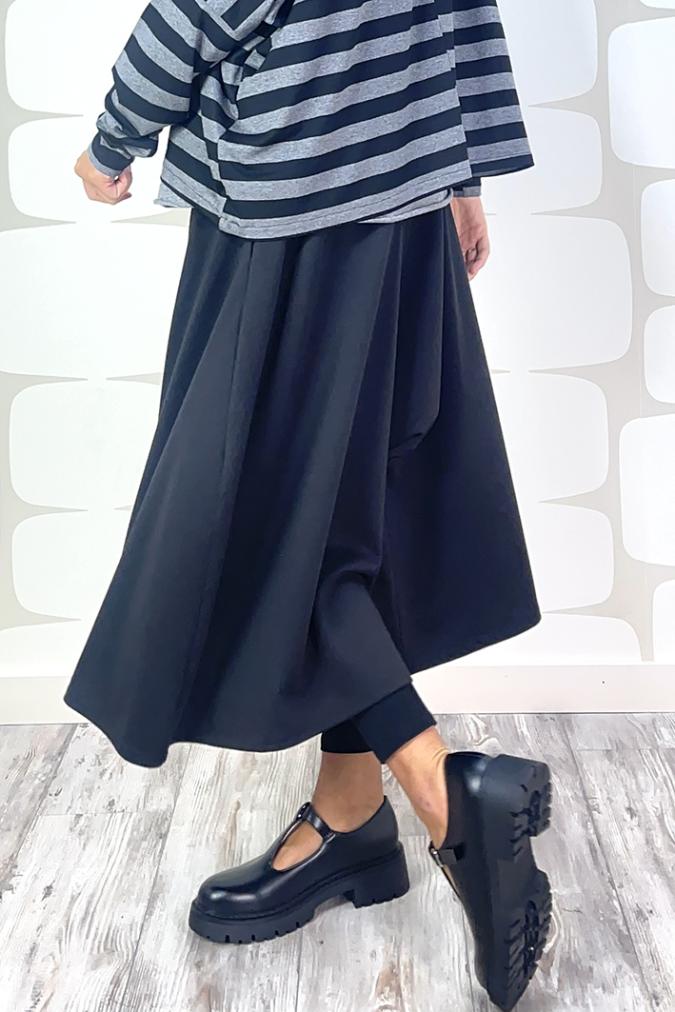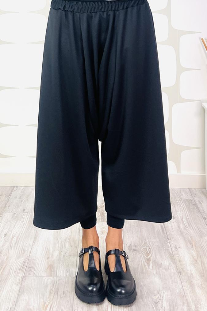 Pantalone sartoriale dalla linea ampia con cavallo basso. Tasche laterali e comoda vita elasticizzata.
